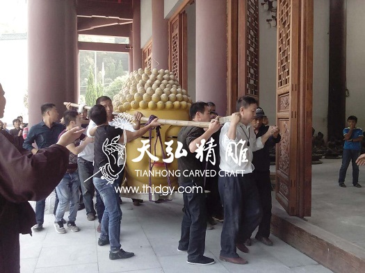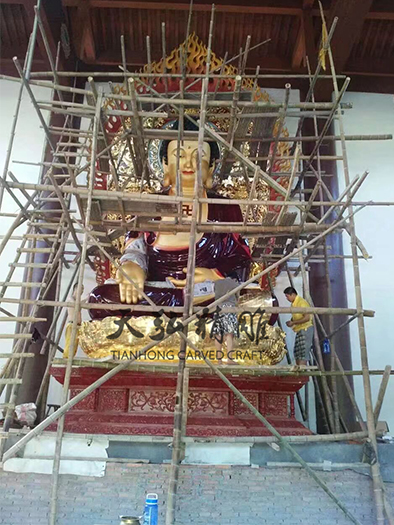 灵瑞寺阿弥陀佛主佛总高6.6米,精选樟木雕成,现装金完毕,慈容满面,无比殊胜庄严,见者赞叹不已。天弘员工们的工作精神和技术工艺真不是盖的,了不起!